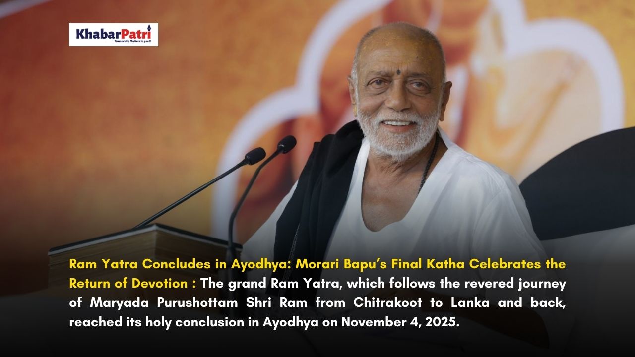 Ayodhya: The grand Ram Yatra, which follows the revered journey of Maryada Purushottam Shri Ram from Chitrakoot to Lanka and back, reached its holy conclusion in Ayodhya on November 4, 2025. During this momentous event, Pujya Morari Bapu shared the final Ram Katha in the presence of thousands of devoted followers.