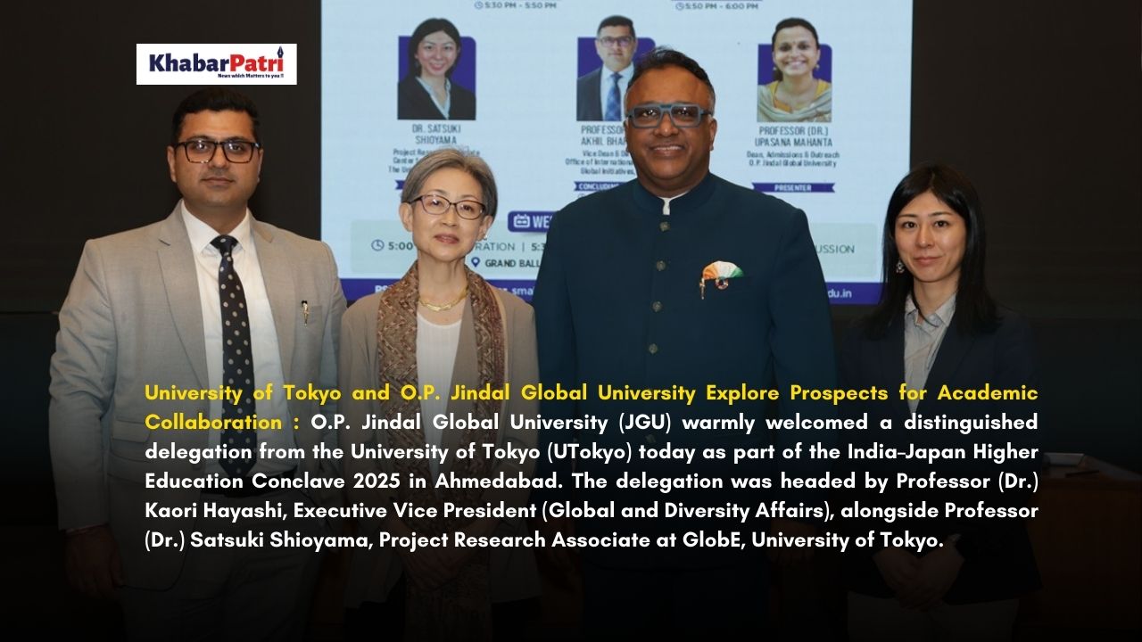 Ahmedabad: O.P. Jindal Global University (JGU) warmly welcomed a distinguished delegation from the University of Tokyo (UTokyo) today as part of the India–Japan Higher Education Conclave 2025 in Ahmedabad. The delegation was headed by Professor (Dr.) Kaori Hayashi, Executive Vice President (Global and Diversity Affairs), alongside Professor (Dr.) Satsuki Shioyama, Project Research Associate at GlobE, University of Tokyo.