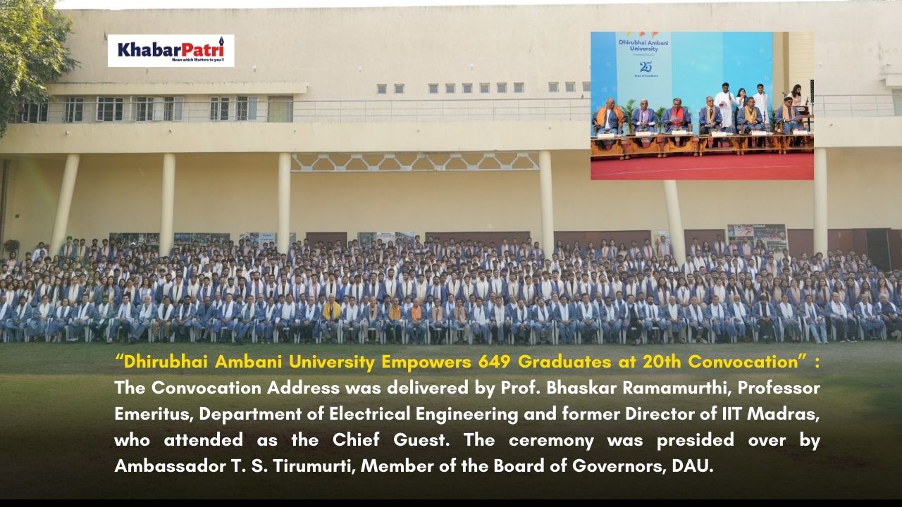 Gandhinagar : Dhirubhai Ambani University (DAU), formerly known as DA-IICT, hosted its 20th Convocation Ceremony at its Gandhinagar campus on Saturday, conferring degrees on 649 graduates across undergraduate, postgraduate, and doctoral programmes.