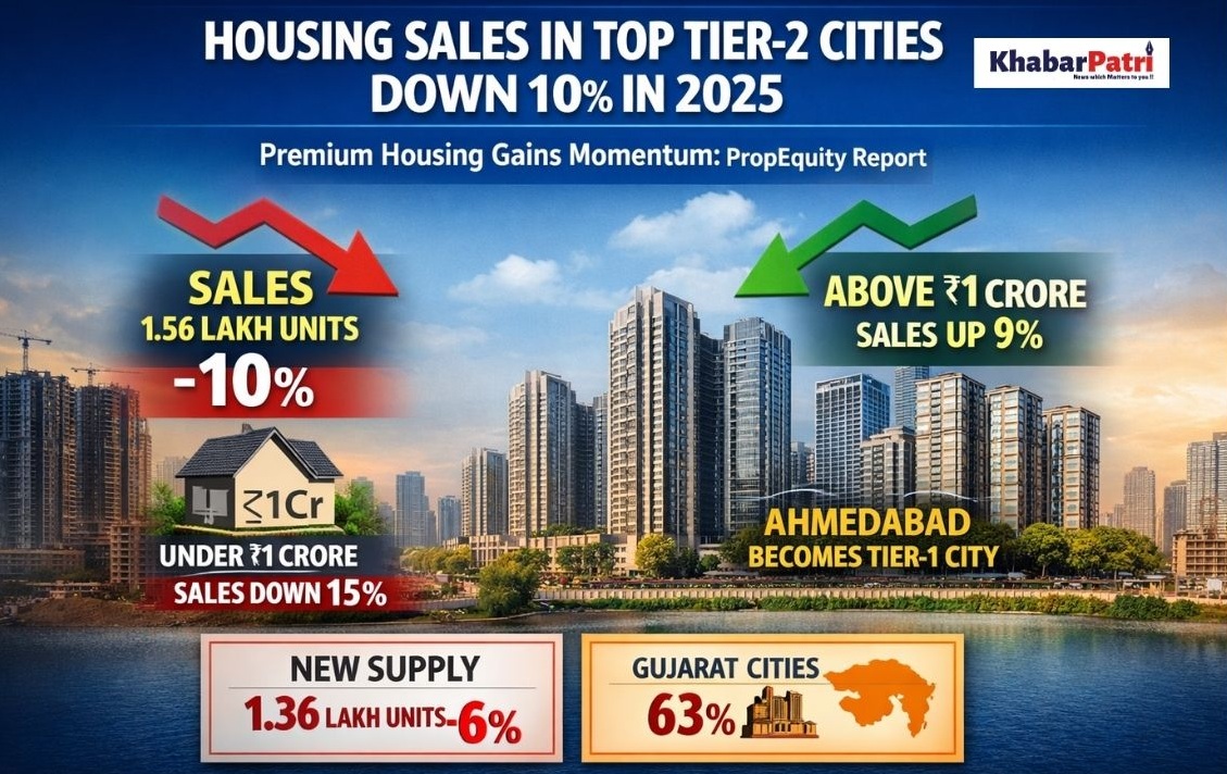 National : Housing sales across India’s top 15 tier-2 cities declined 10% year-on-year in 2025 to 1,56,181 units, even as the overall sales value remained stable at ₹1.48 lakh crore, according to a report by NSE-listed real estate data analytics firm PropEquity. The slowdown reflects rising housing prices, affordability pressures, and a visible shift towards premium housing.