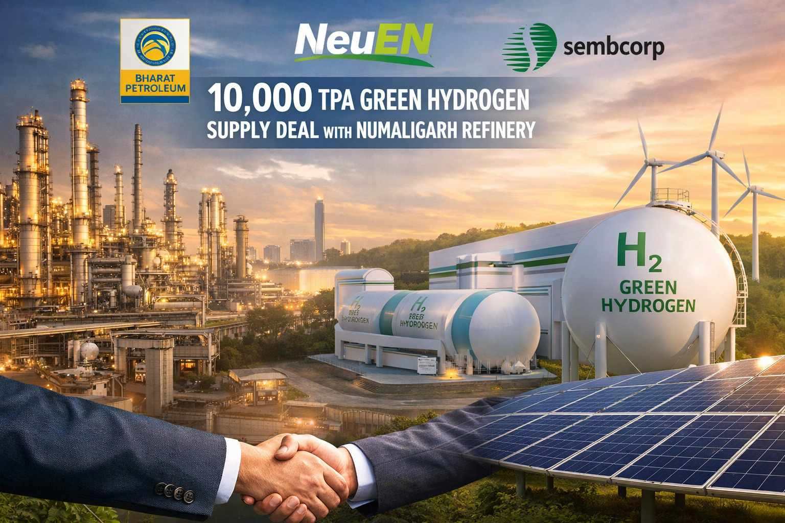 New Delhi: NeuEN Green Energy Pvt. Ltd. (NeuEN), a 50:50 joint venture between Bharat Petroleum Corporation Limited (BPCL) and Sembcorp Green Hydrogen India Private Limited, has secured a contract to supply 10,000 tonnes per annum (10KTPA) of green hydrogen to Numaligarh Refinery Ltd. (NRL).